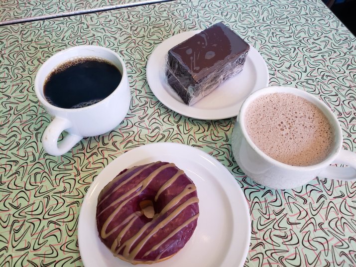 We arrived in time for brunch. Yummers! Hubby ordered the pancake plate and I ordered the biscuits and gravy plate. Hubby also picked out a blueberry maple donut with coffee and I got the signature Little Devil with hot cocoa.