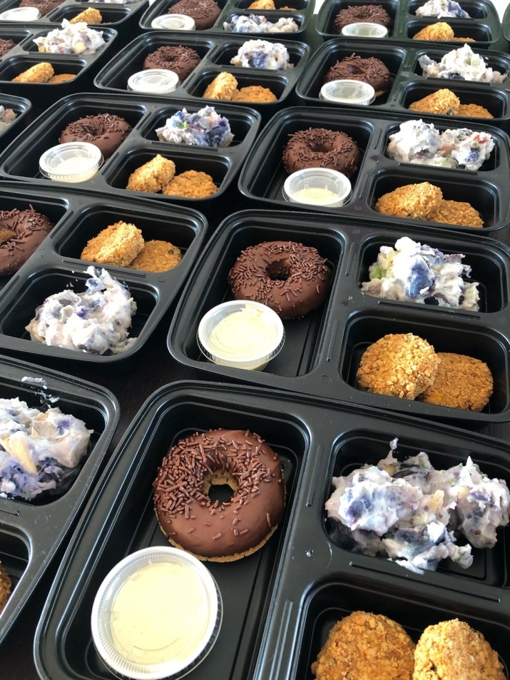 Upon arrival, we scarfed up delicious crabless cakes, purple potato salad, and a chocolate donut from Soy Cafe.