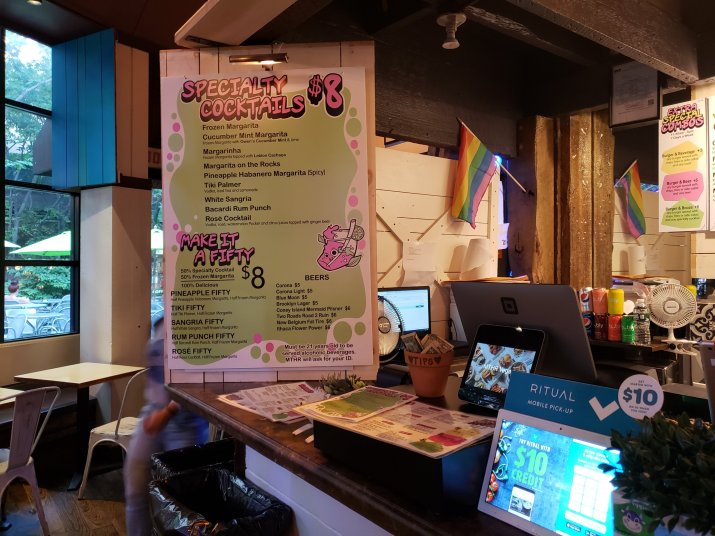 In addition to always trying vegan mac n cheese, I am usually drawn to Cesar salad and ordered that. Hubby picked out french fries with aoli and the Tiki-Palmer. I also got a German chocolate brownie that I was too full to actually try after the giant salad. My friend got the tacos, of course.