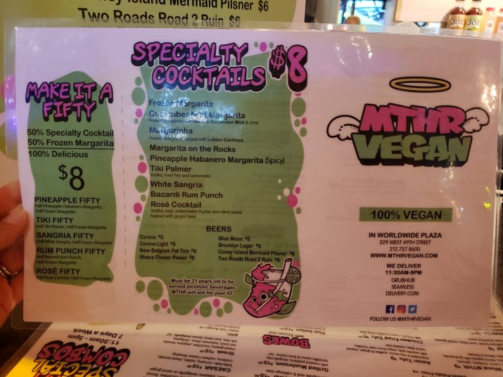Midtown Manhattan sees hundreds of thousands of people every year, in addition to those who live and work in the area. But there lacks a concentration of vegan restaurants. So I was thrilled to learn that MTHR Vegan (pronounced Mother Vegan) opened on the west side. A friend raved about the cauliflower tacos, so of course I had to try them.