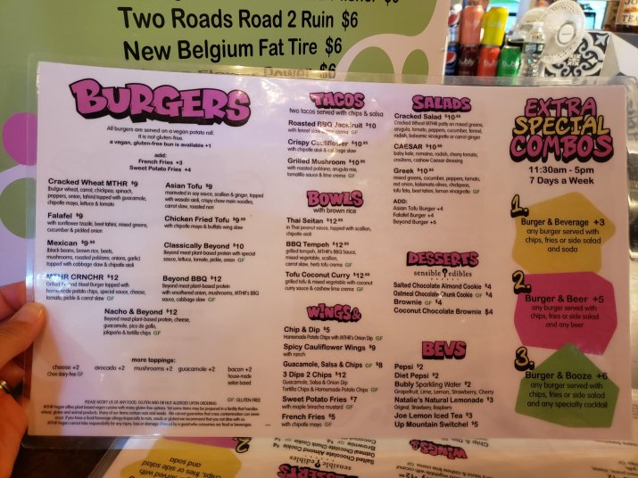 MTHR Vegan has lots of seating outside on beautiful days, but I visited during a “heat dome” and needed to sit inside. A simple space with tables along the windows and a long counter to order and pick up food.