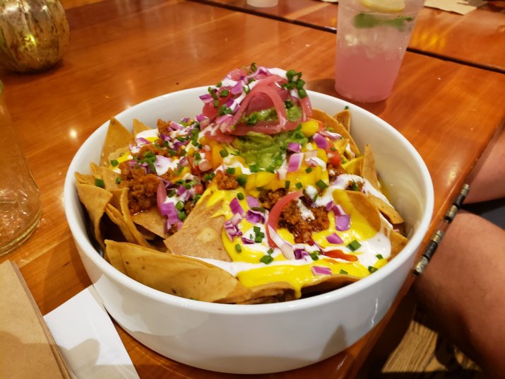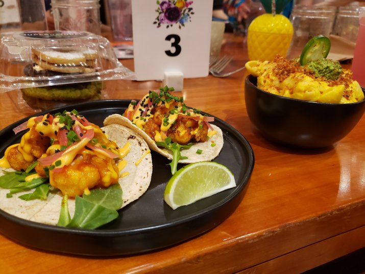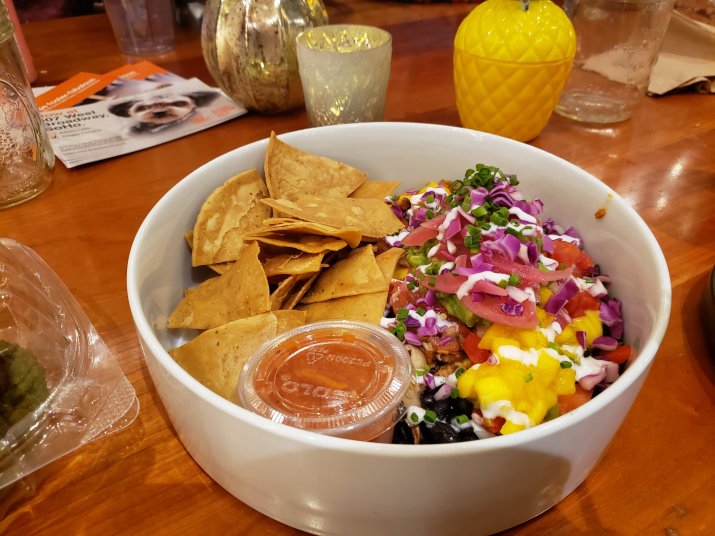 We picked out the burrito bowl, cauliflower tacos, and mac n cheese, as well as cookies for later. A friend got the nachos.