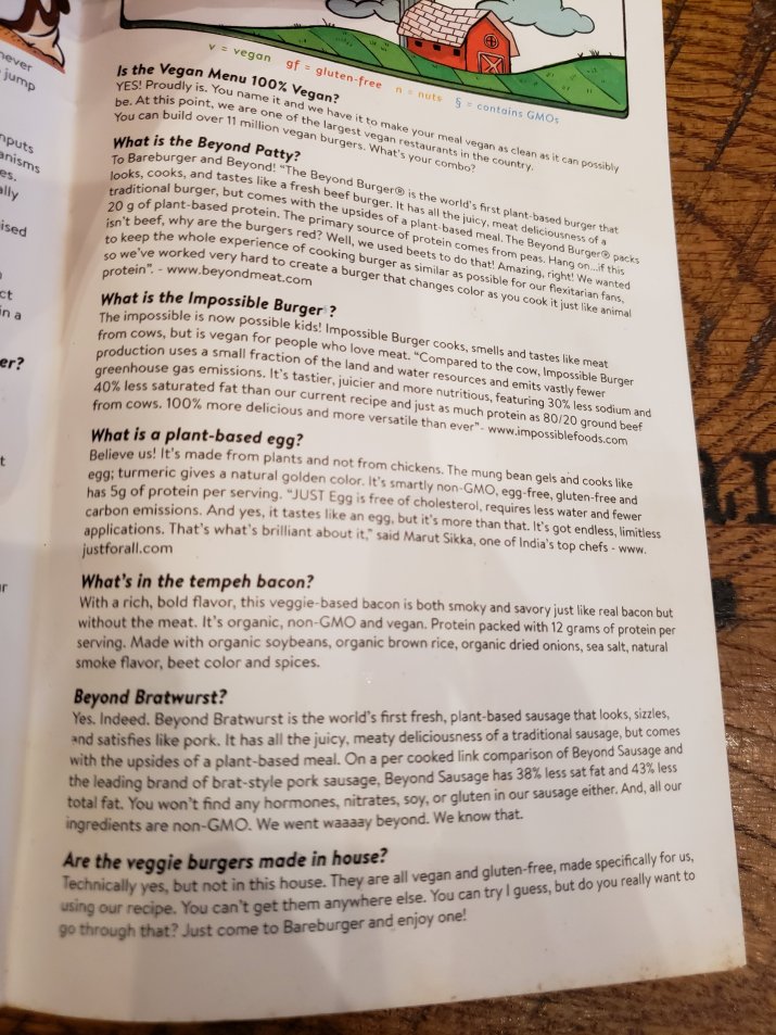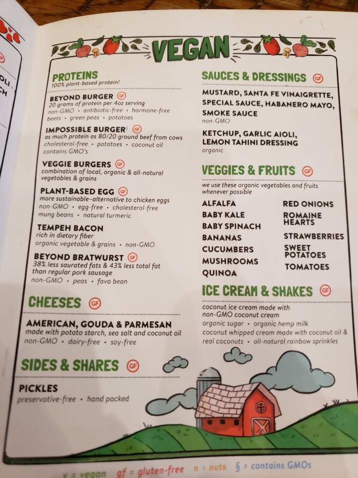 An entire side of the menu is now vegan (there are only two sides)! Bareburger focuses on burgers, so it was not a surprise to see several burger options. But there are also salads, fries, and milkshakes.