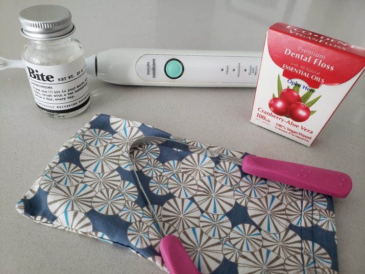 Flossing daily is also important and my dentist recently shared that flossing should happen at about the same time each day. I didn’t know that. I just floss before I brush my teeth at night. It happens to be at about the same time each evening. Winning! Right now I am using a floss that comes in a cardboard package. It doesn’t have the best flavor, but I like the less waste and not plastic container.