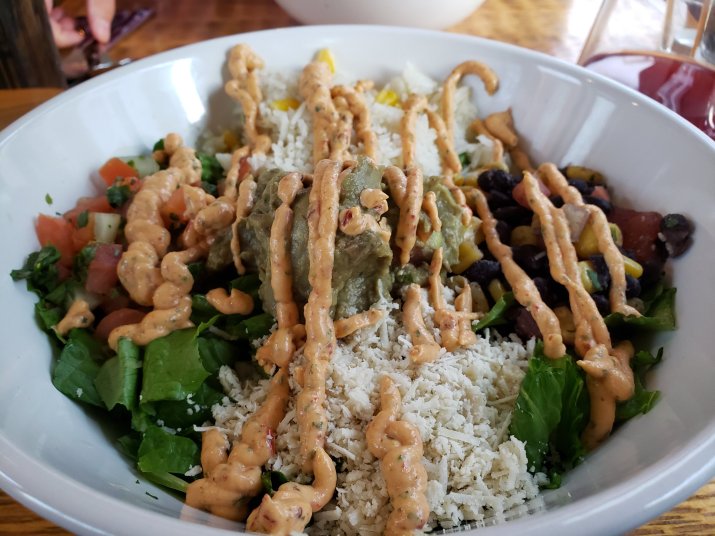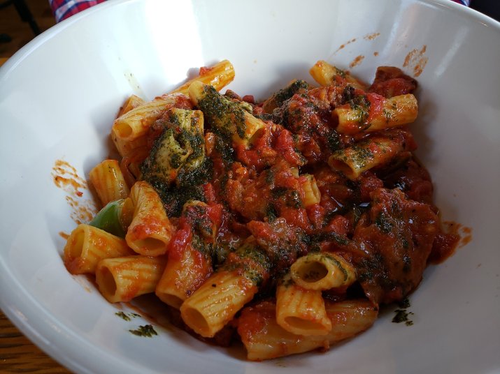 We finally settled on a Southwestern Bowl for me and the Rigatoni and Sausage Fra Diabolo with the Greyhound Cafe Salad, their version of a Cesar Salad, for hubby.