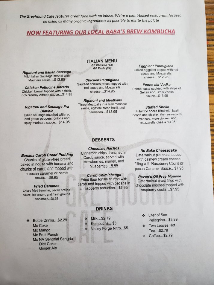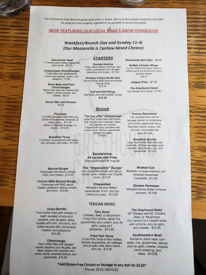 Greyhound Cafe gets four out of five vegan cupcakes. Our server was great and the place clean.