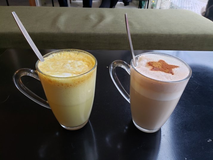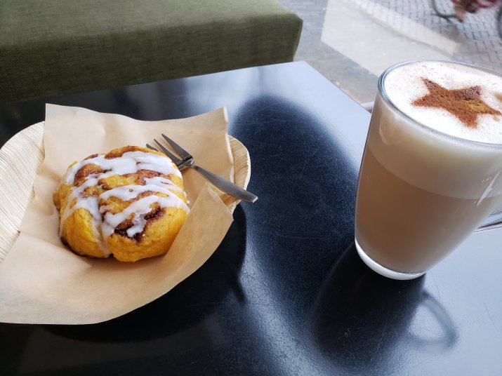 I decided on the Glorious Grains and Rainbow Roots, a tumeric soy milk latte, and a chocolate cupcake to share with hubby. Hubby picked out a chai latte and cinnamon roll. I think he didn’t want to share and that was why he picked such cinnamon heavy treats (I’m allergic to cinnamon).