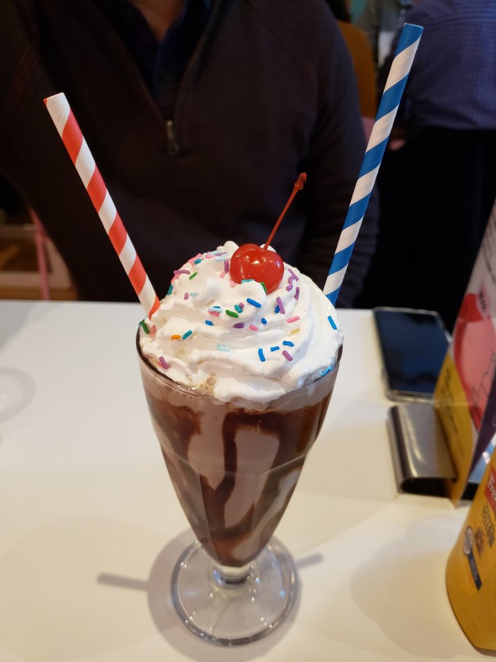 We both enjoyed our burgers and the fries. Mine was crispy, the way I like, with lots of vegetables. We had a little room left and ordered a chocolate milkshake.
