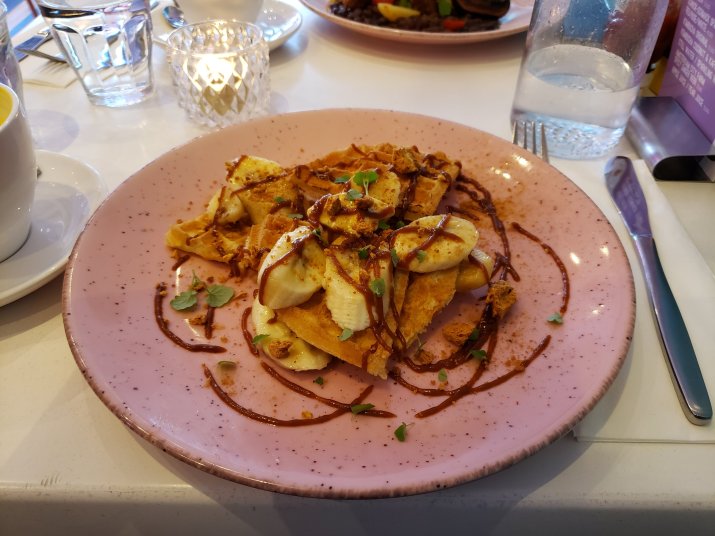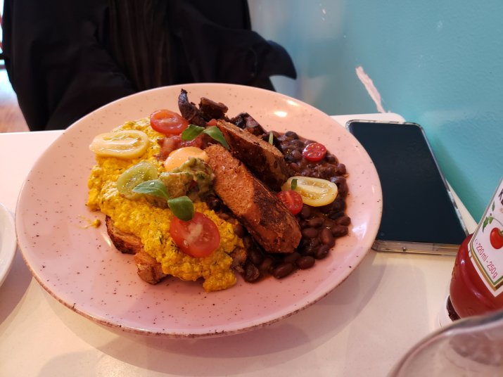 Our second visit watched us share waffles and Mama’s Big Champion of tofu scramble, toast, Beyond Sausage and beans.