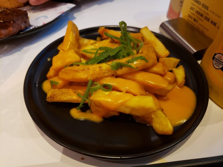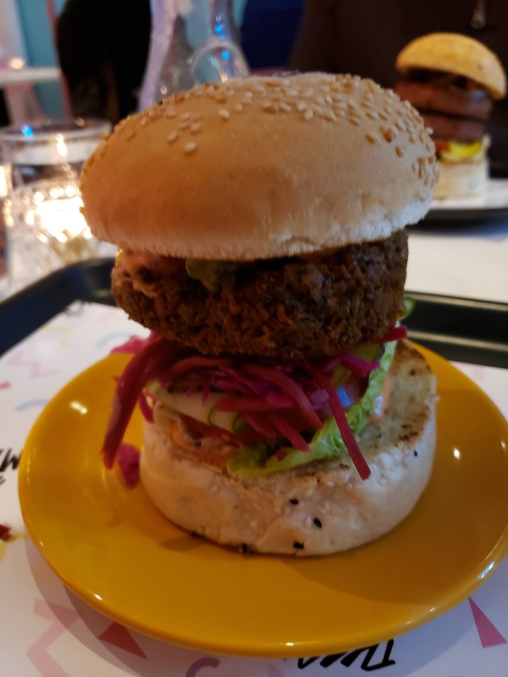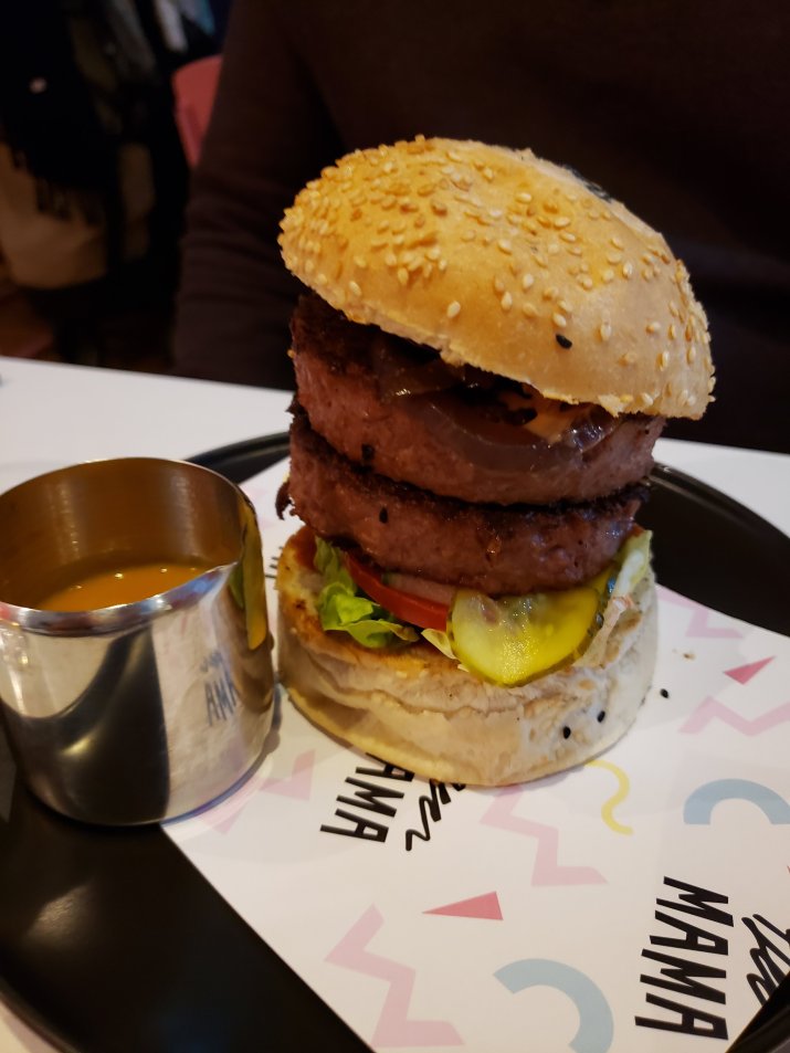 Not having grown up with these, they were a bit strange to us. But we had fun eating them and moved on to foods we would recognize. I ordered a Green Monster, which is kind of like a falafel burger, and Hubby got the Mama’s Double Cheesy, a two layer Beyond Burger with cheese to pour on. We also got cheesy fries to share.