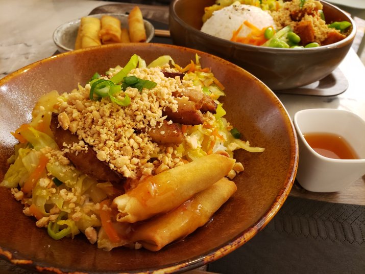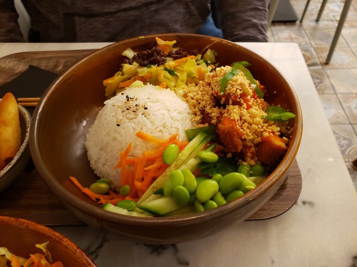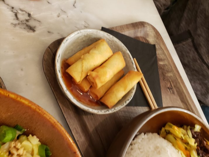 I selected the Lin’s Rice Noodle Bowl and Hubby got the Crispy Chicky Bowl. We adored both! We also got spring rolls, because why not?
