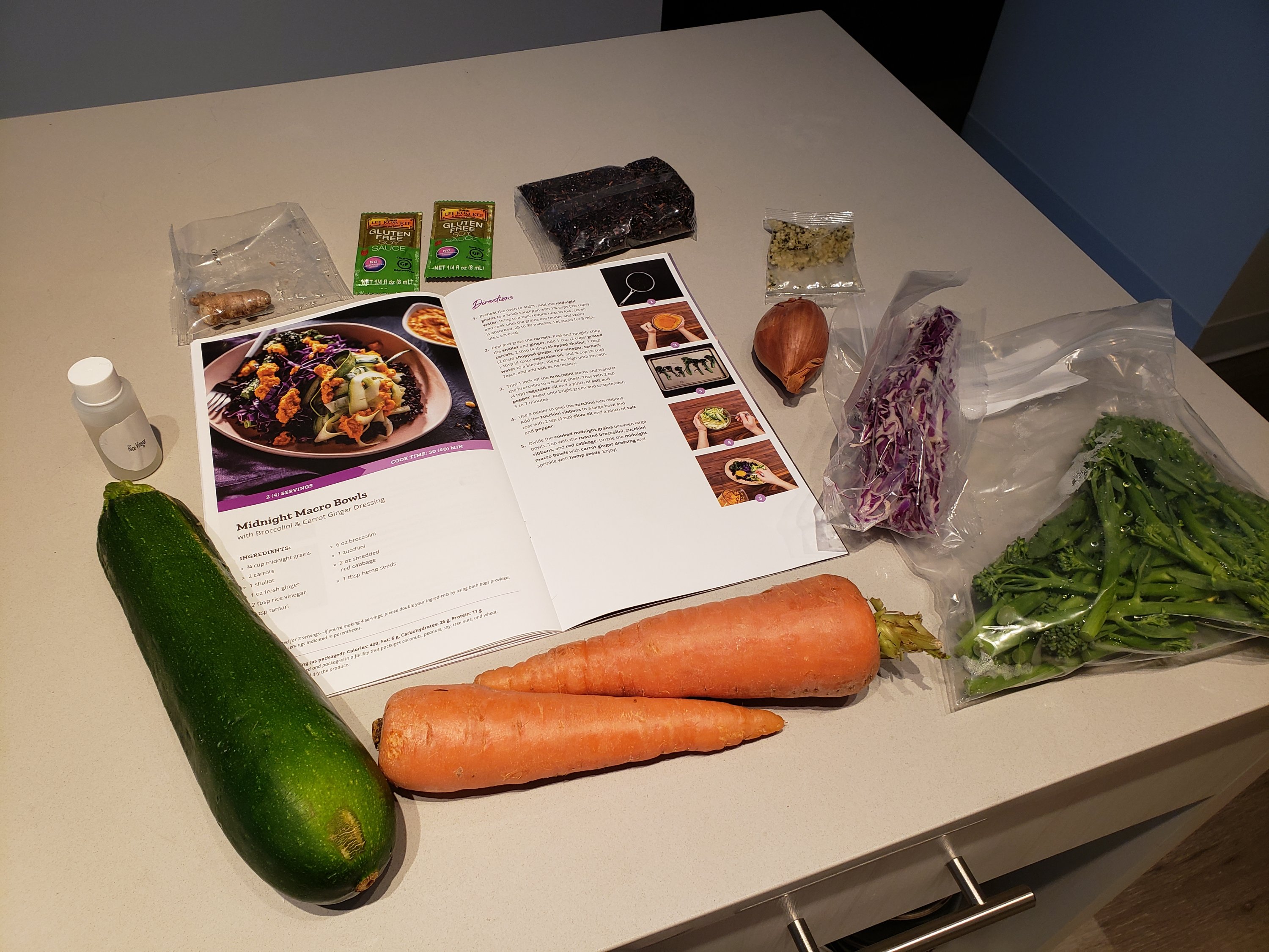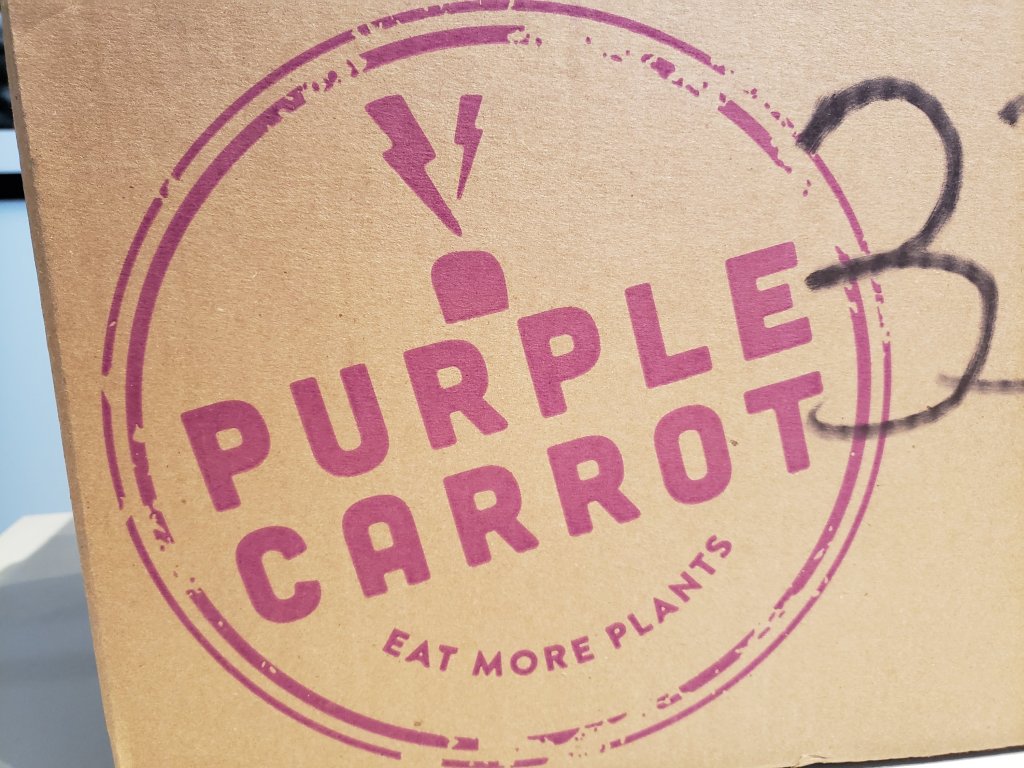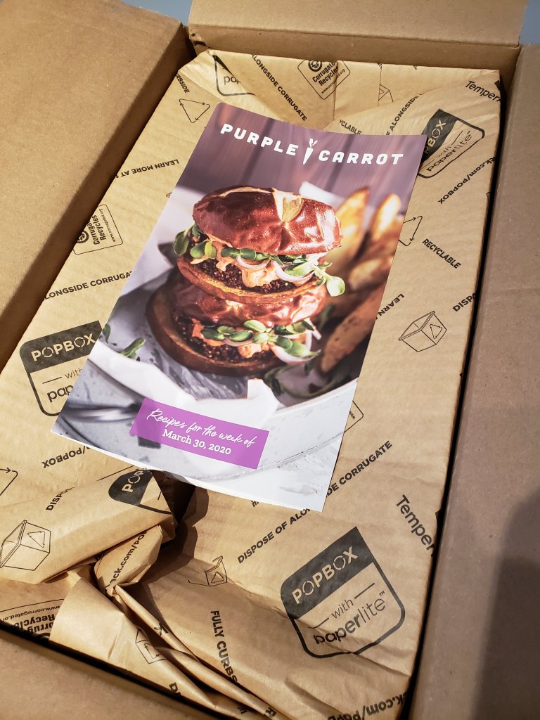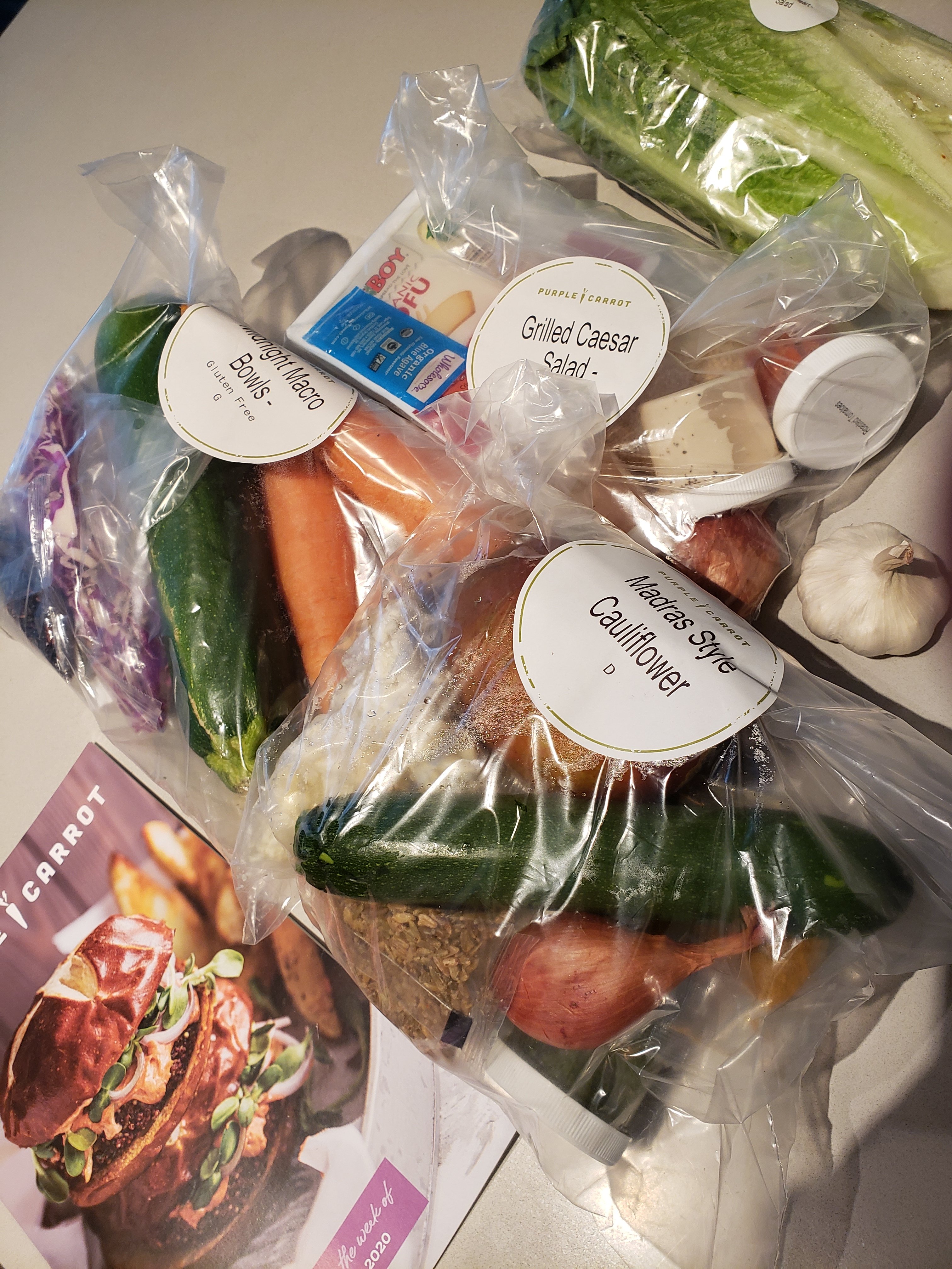 A friend invited me to try Purple Carrot. For free, the fixings for three meals arrived at my door. This is very exciting since I’m stuck at home anyway and not wanting to go grocery shopping if I can help it.