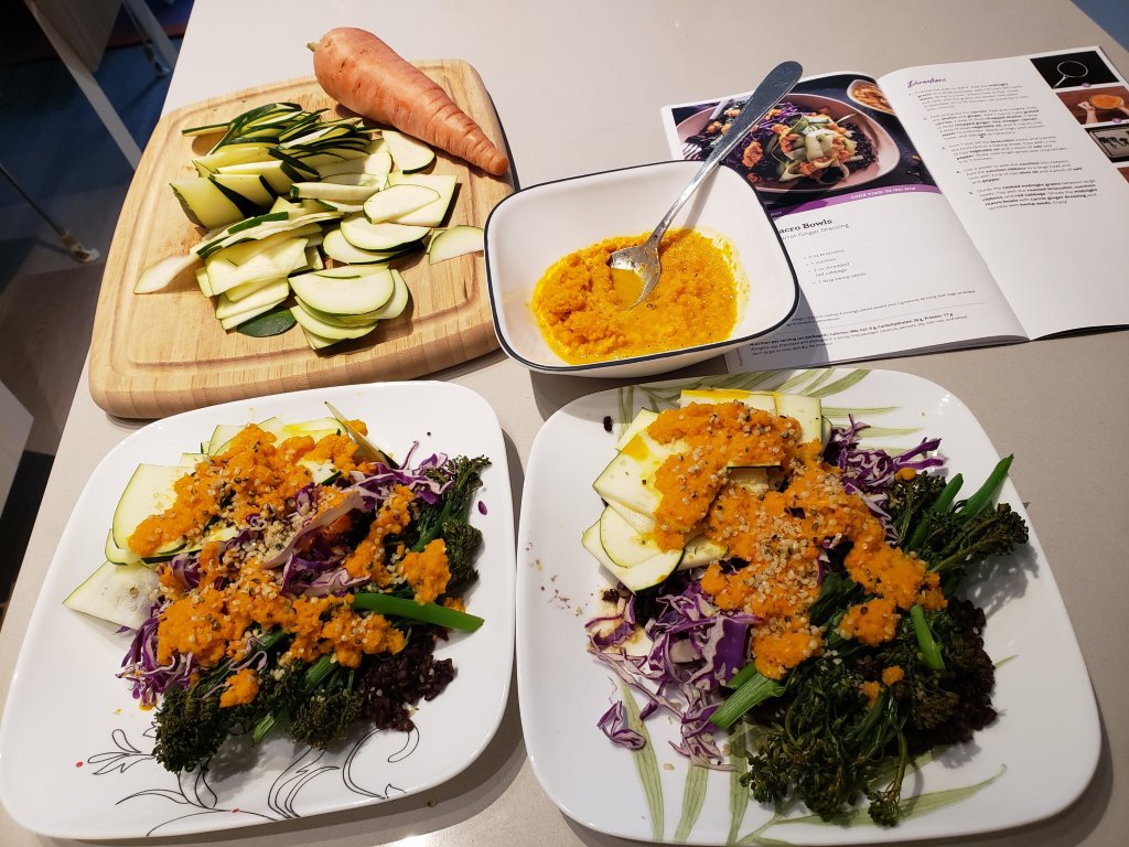 This is the dish that would have benefitted from a vegetable peeler. Instead, I sliced the zucchini as thin as I could and didn’t peel the carrot at all. The outside has the most nutrients. The recipe only needed one carrot and half the zucchini. Similar to the cauliflower dish, I opted to air fry the vegetables rather than bake them in oil.