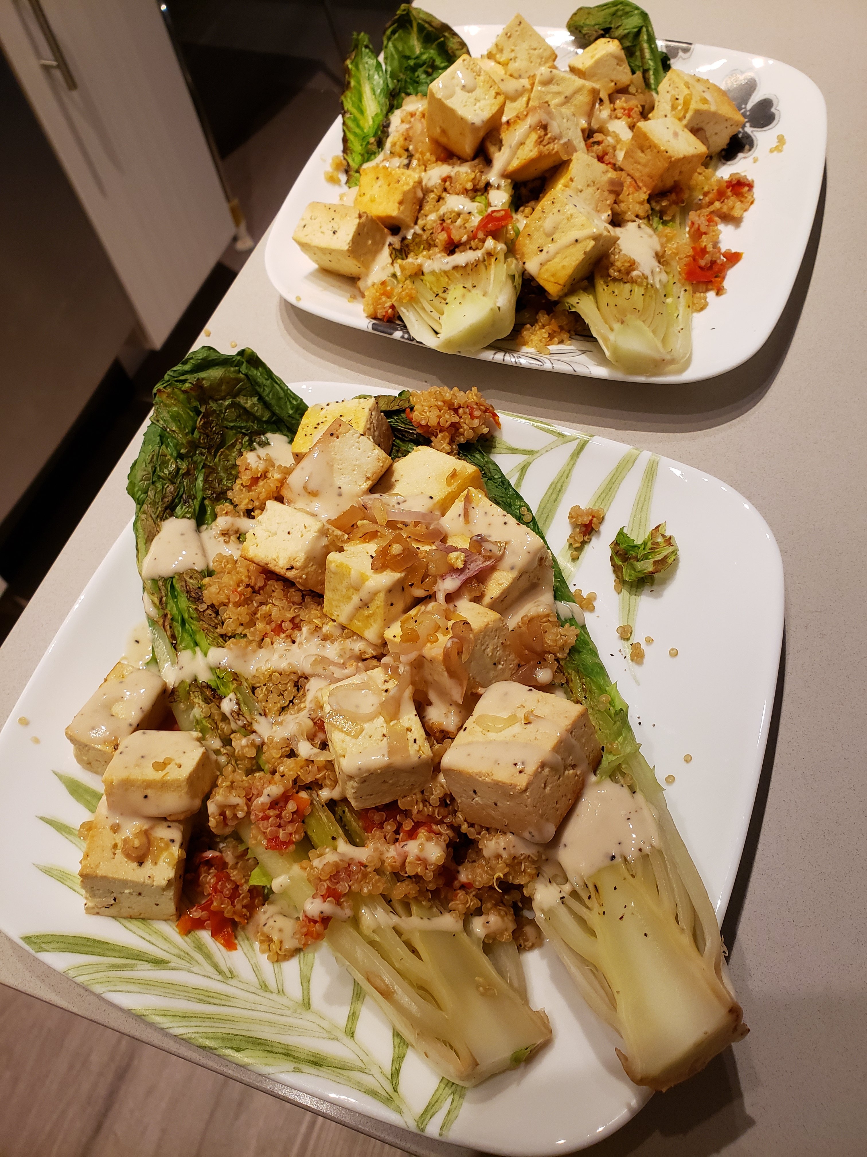 I started with the Grilled Cesar Salad. The grilling of the lettuce caused some damage to my pan. Oops!