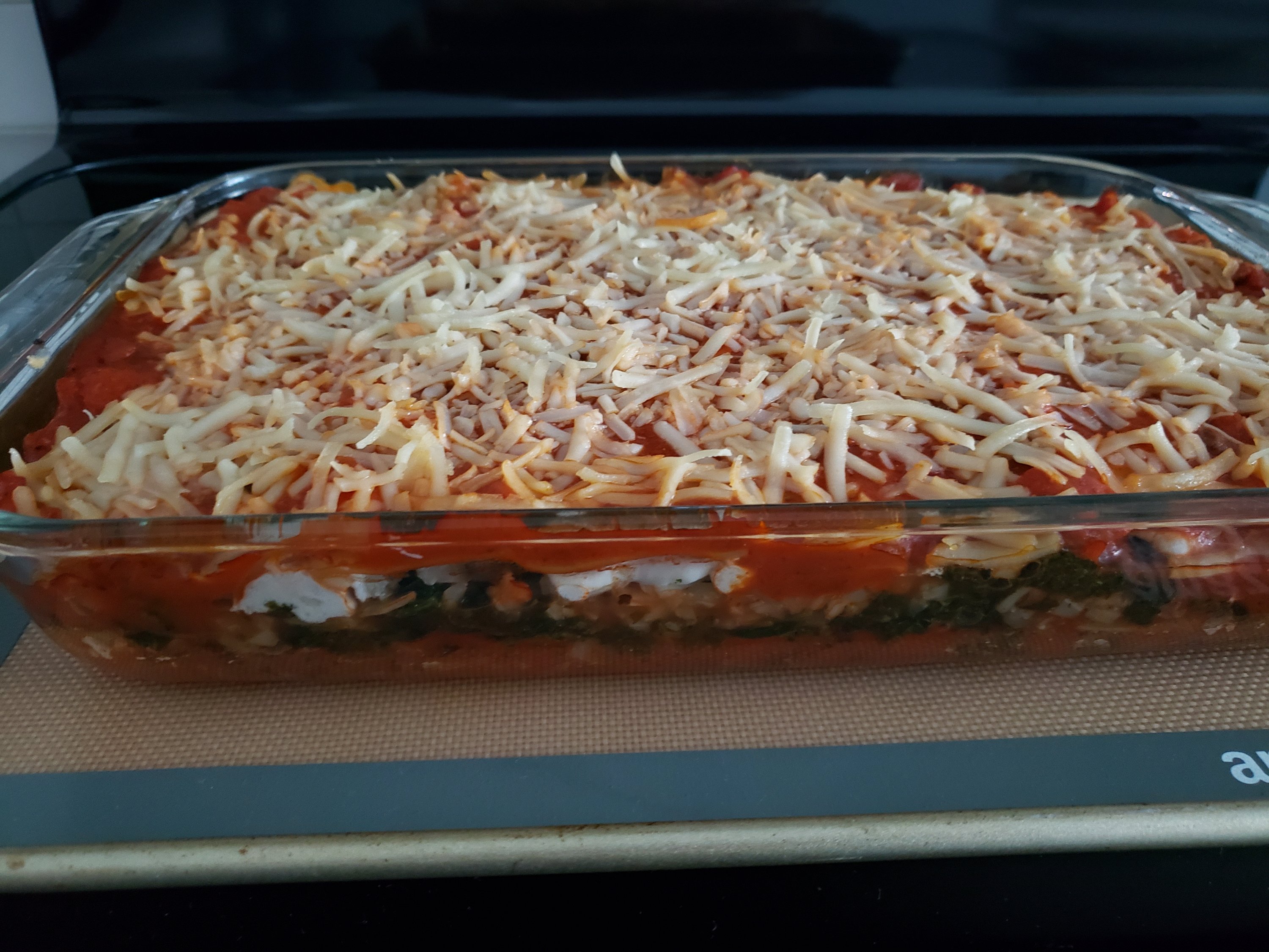 - Layer noodles, 1/2 the frozen spinach, half the ricotta, and 2/3 cup of sauce