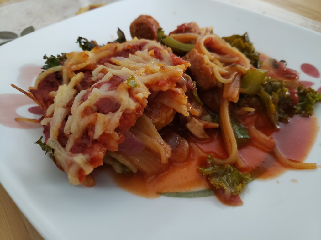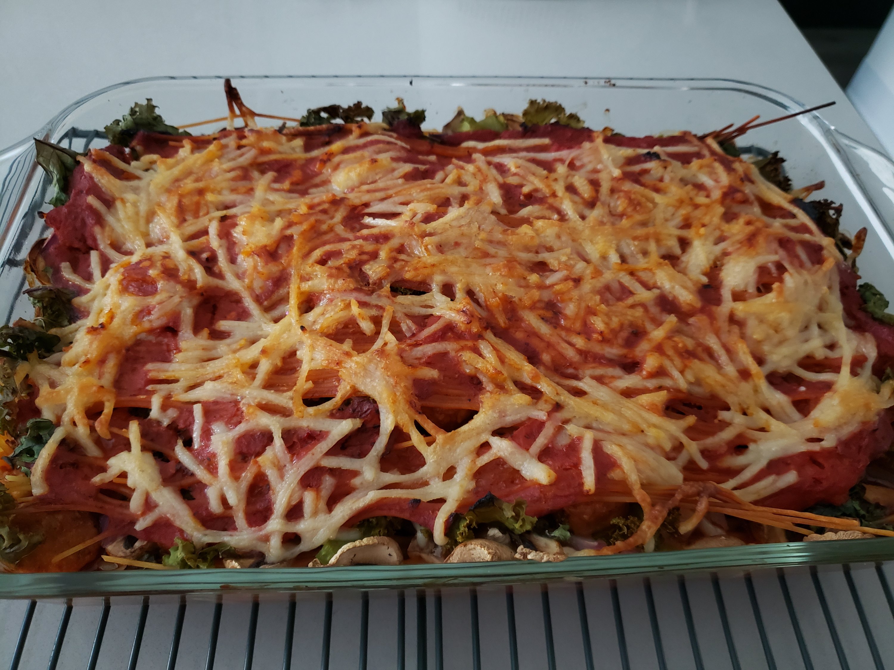 A couple months ago I saw a social media post about spaghetti noodles in a casserole dish. I was intrigued and made the simple recipe that consisted of spaghetti, sauce, faux cheese, and faux meatballs. It wasn’t great, but it was easy and had potential. The original post said it was a family favorite from childhood. My turn to make it awesome!