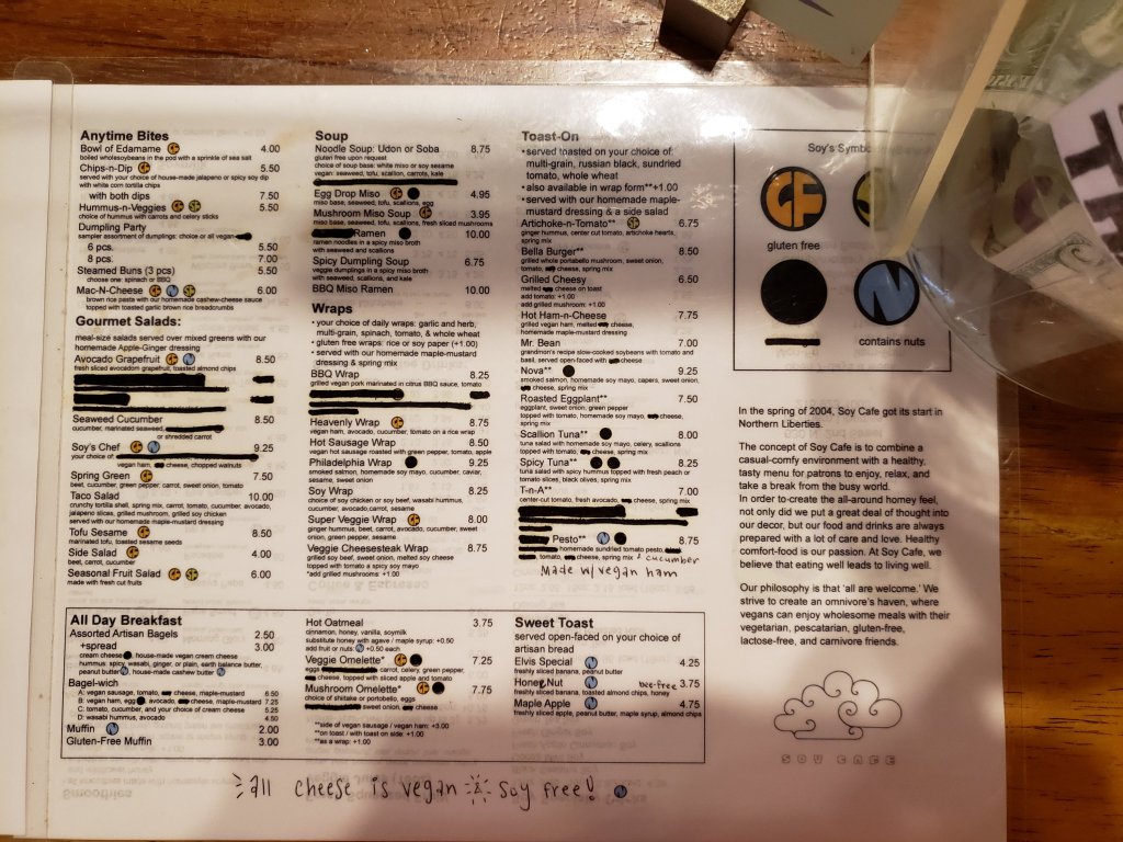 Soy Cafe is one of my absolute favorite places to eat in Philly. The owner seeks to provide healthy and vibrant vegan food. My favorite dishes are the Pho, Sesame Tofu salad, and the Tomato and Avocado sandwich. But there are lots of great options.