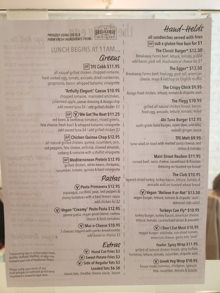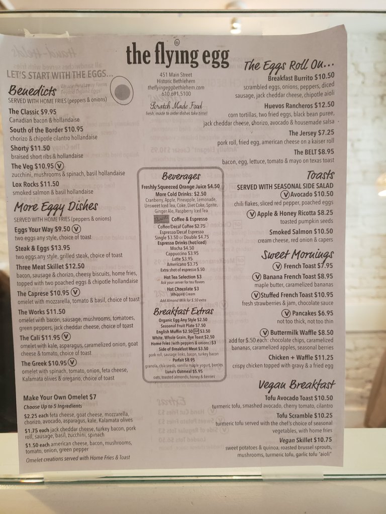 The Flying Egg in Bethlehem, Pennsylvania has decent reviews for their vegan options, but I terribly disappointed. We visited for brunch on a Sunday and it was pleasantly busy. Despite a cold morning, we sat outside to stay safe. The inside was full of people without masks, talking loudly, and not social distancing. A bad combination during the current pandemic.