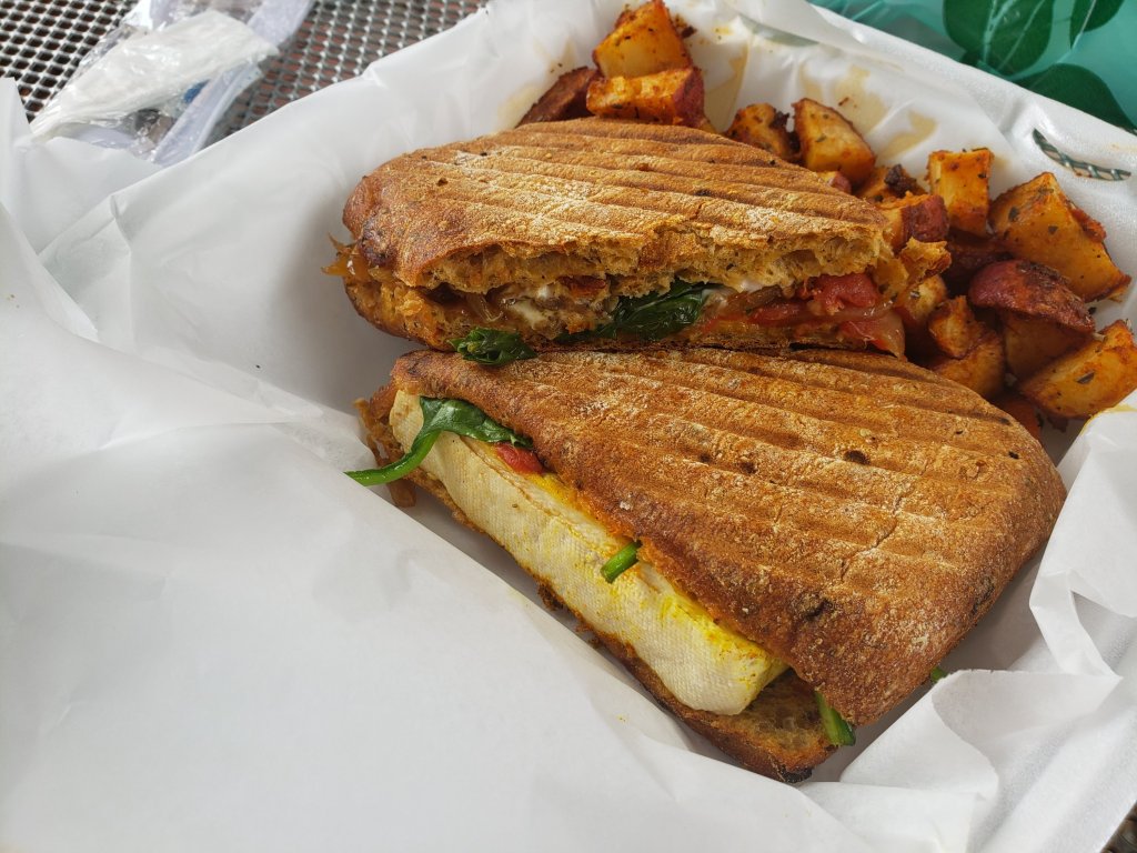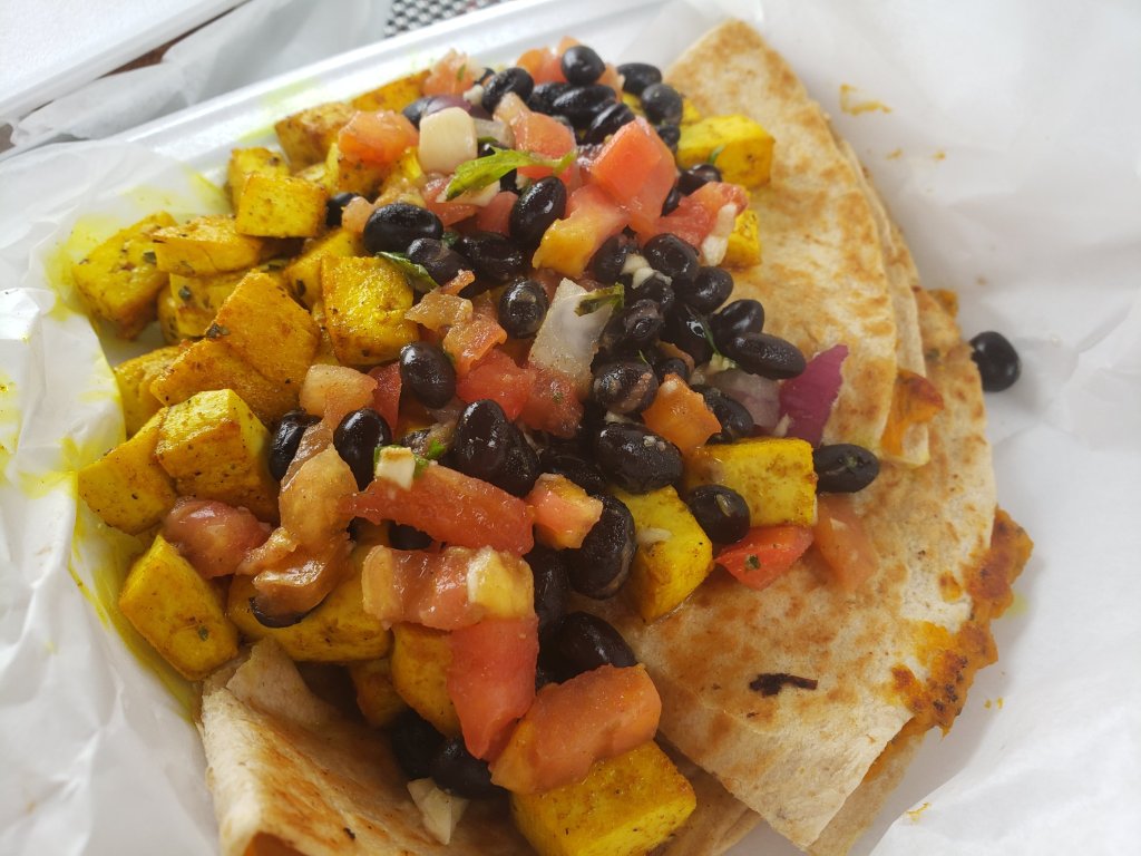 Like most places, indoor dining was unavailable. Again, not an issue for us trying to avoid airborne germs. I picked out the vegan sweet potato quesadillas with tofu and hubby picked out the vegan Mary sandwich.