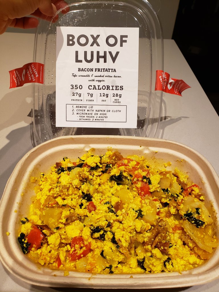 We tried the bacon frittata and Bok Choy Tofu first. Starting frozen, the food was a bit watery, but tasty.