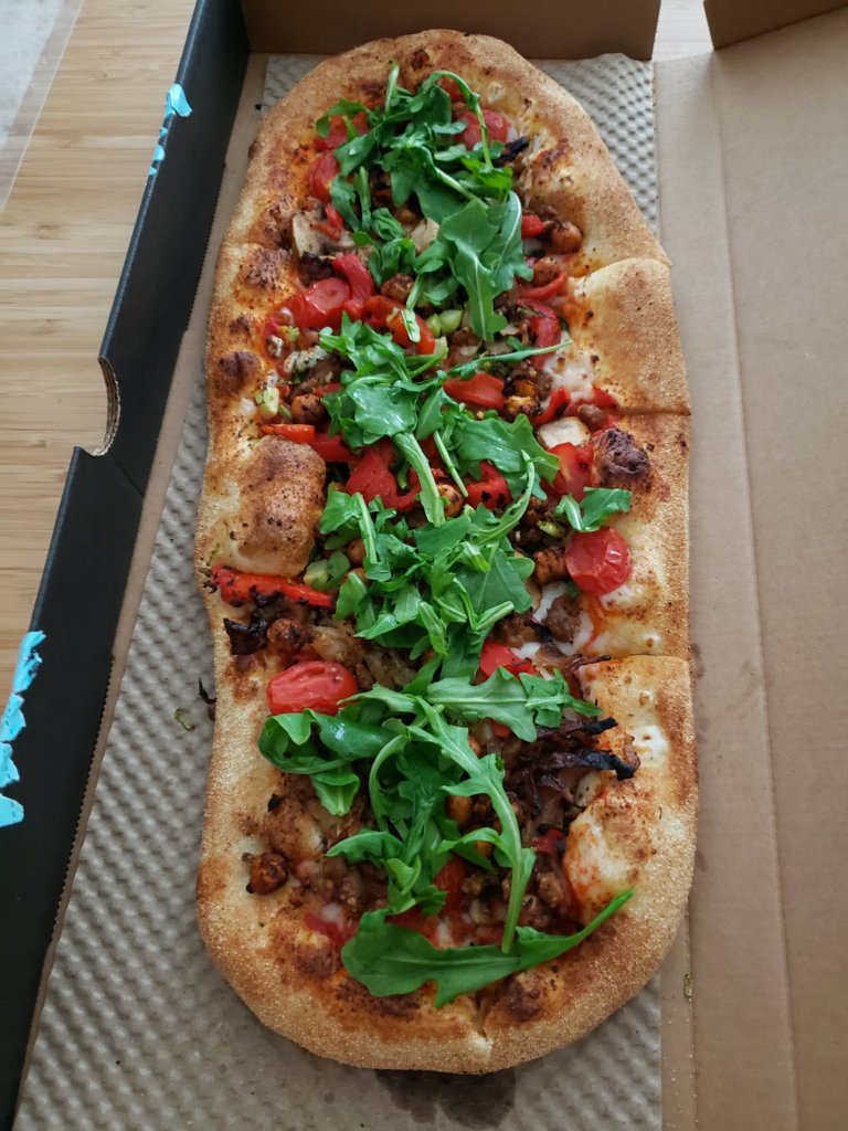 Hubby decided to order pizza as a surprise. He really wanted some. And it was delivered fairly quickly, which is always a nice experience. He ordered lots of toppings in addition to what came with the pizza. It has faux sausage, chickpeas, and arugula with all the other veggies.