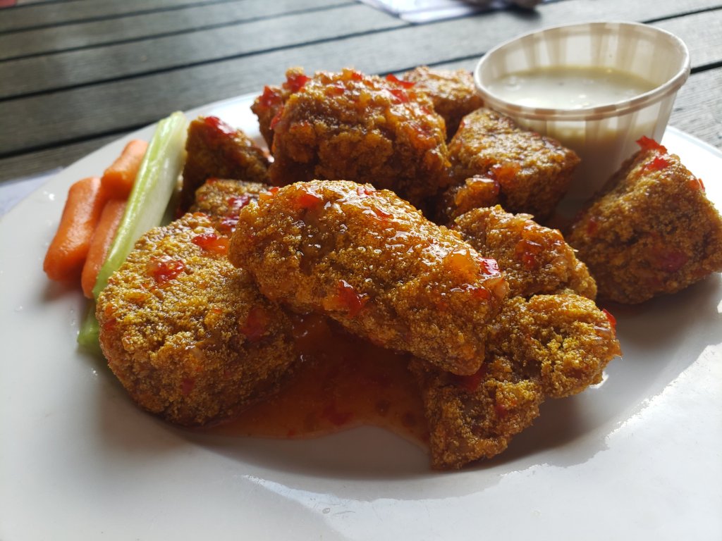 We started with Sweet Chili wings. Made of seitan, these are breaded, which is a bit different.