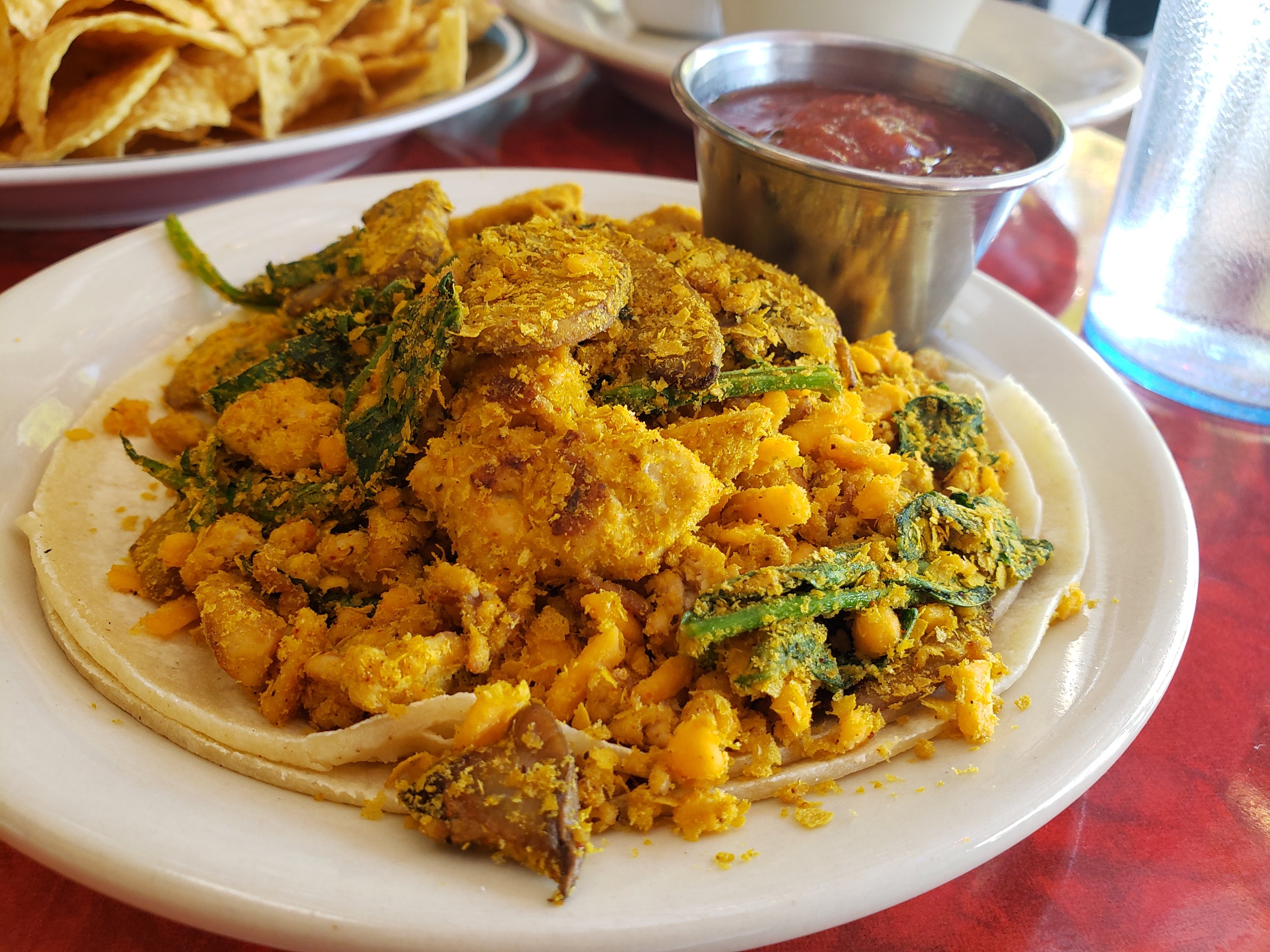 Being in Austin, I had to order a taco! Breakfast tacos are common fare in Austin. I picked out the Neal Taco with tofu. Hubby picked The Benedict and Vegan Tex Mex Chips n Queso to share.