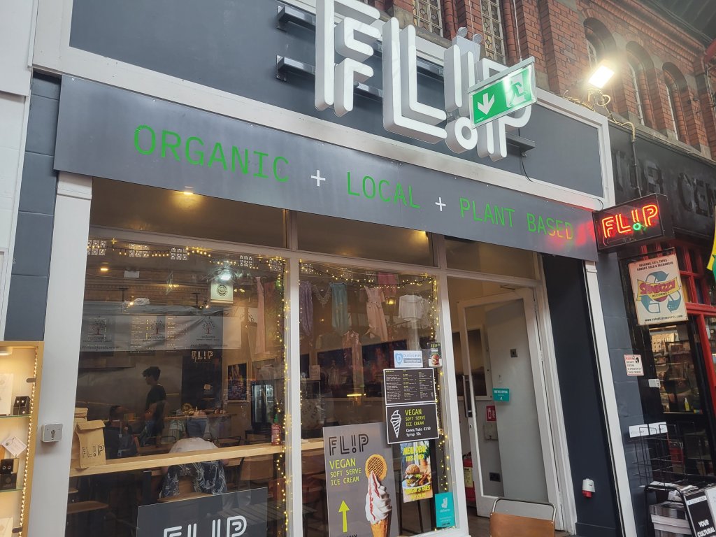 In George’s St. Arcade in Dublin, Ireland, there is a small vegetarian restaurant called Flip. The arcade is a marketplace that is also worth exploring. The thing is that it all closes before dinnertime. Visits have to happen during the day.