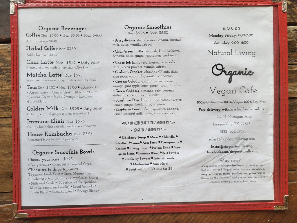 An unassuming house in an unassuming neighborhood holds a very fun treasure of vegan and gluten-free delights. Natural Living Organic Food Co-op & Cafe in League City, Texas is rated highly and is halfway between Houston and Galveston. I wanted to give it a try and was not disappointed.