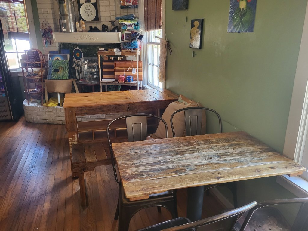 There are a few tables inside and a picknick table outside. It was too hot for us to want to sit outside.