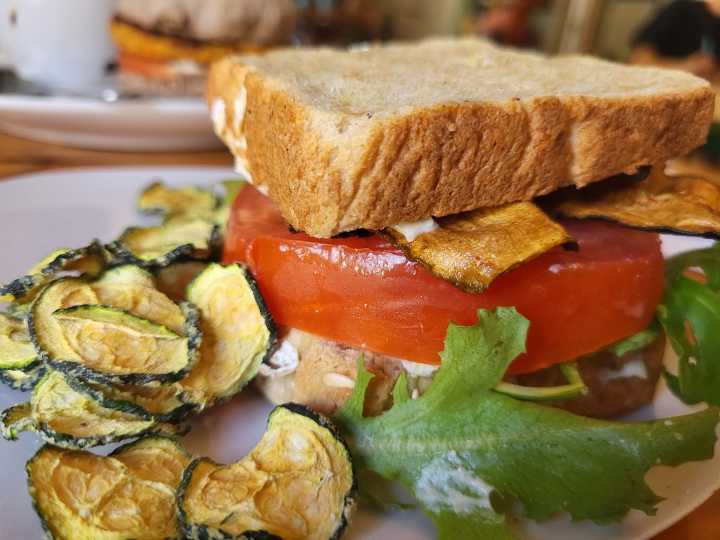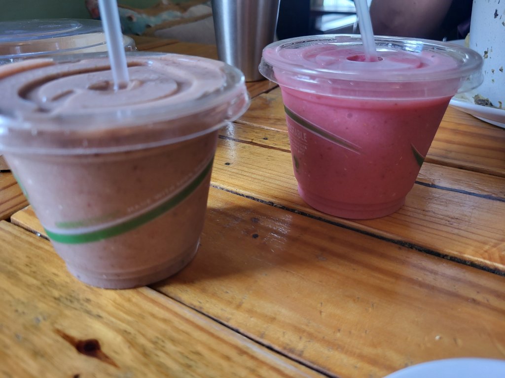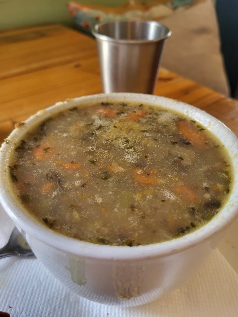 Not being able to pick just one thing and very hungry, Hubby and I shared everything. Together, we picked out the Chicken Patty Sandwich with a cup of mushroom and potato soup and BLT Avocado Sandwich with zucchini chips. Hubby also picked out the Rasberry Lemonade Smoothie that I found to be too sweet and he enjoyed. I got the Berry-licious Smoothie with kale, which was just up my alley. We also picked out “Ding Dongs” for dessert.