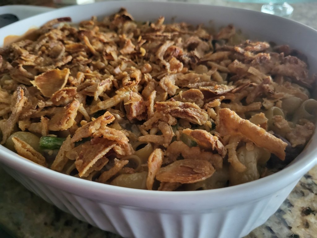 Place the casserole with the crispy onions back in the oven, uncovered. Bake for 10 minutes. Remove from oven and enjoy. The casserole will be hot.