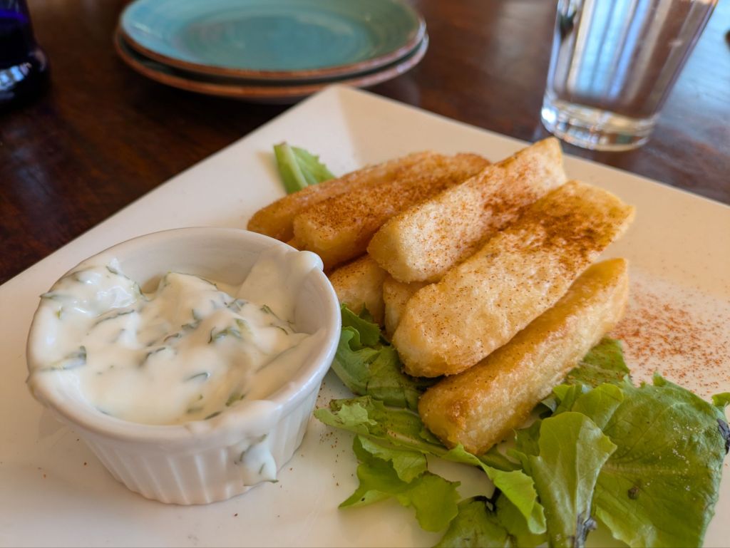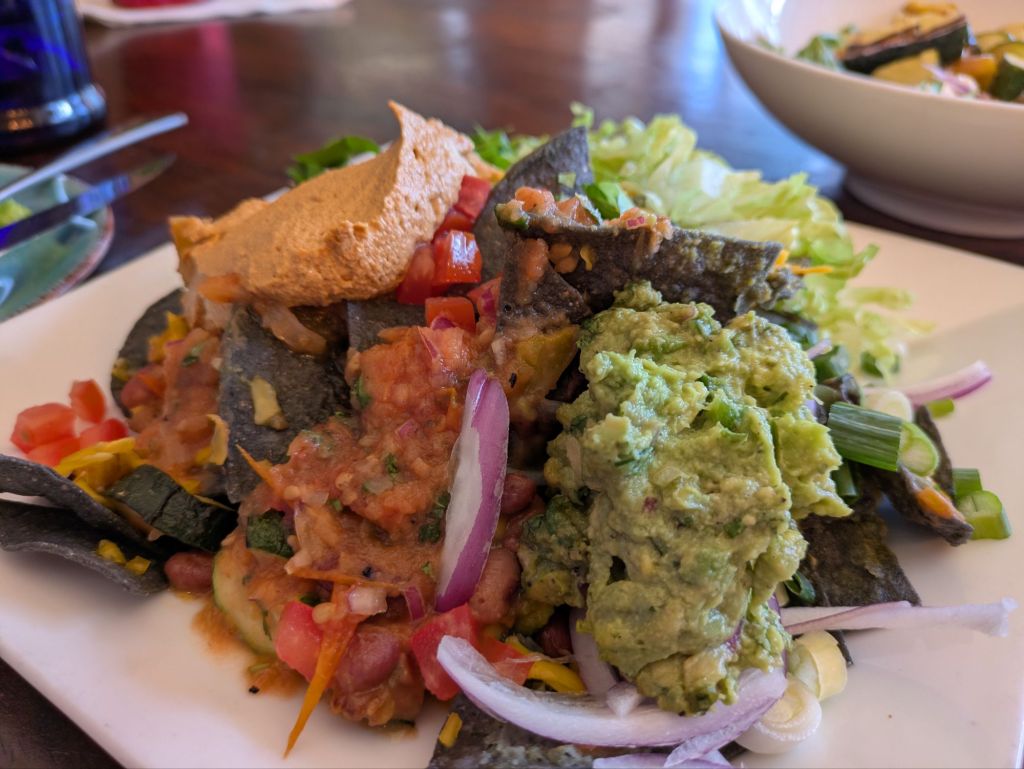 To start our meal, we ordered the yuca fries and nachos. A whole meal can be made from the nachos! The cashew cheese is delightfully spicy.